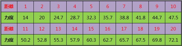 以下表格中,右邊的力度對應左邊的距離。